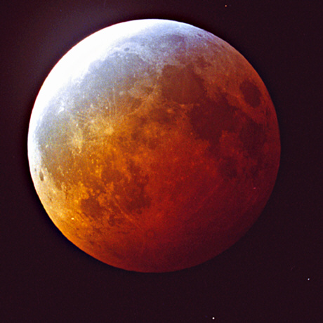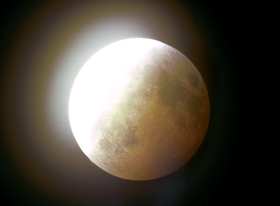 durch die Erdatmosphäre hervorgerufene Rotfärbung der Mondoberfläche zu erkennen.