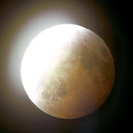 Der Mond im Schatten der Erde. Die rötliche Färbung wird durch Sonnenlicht verursacht,